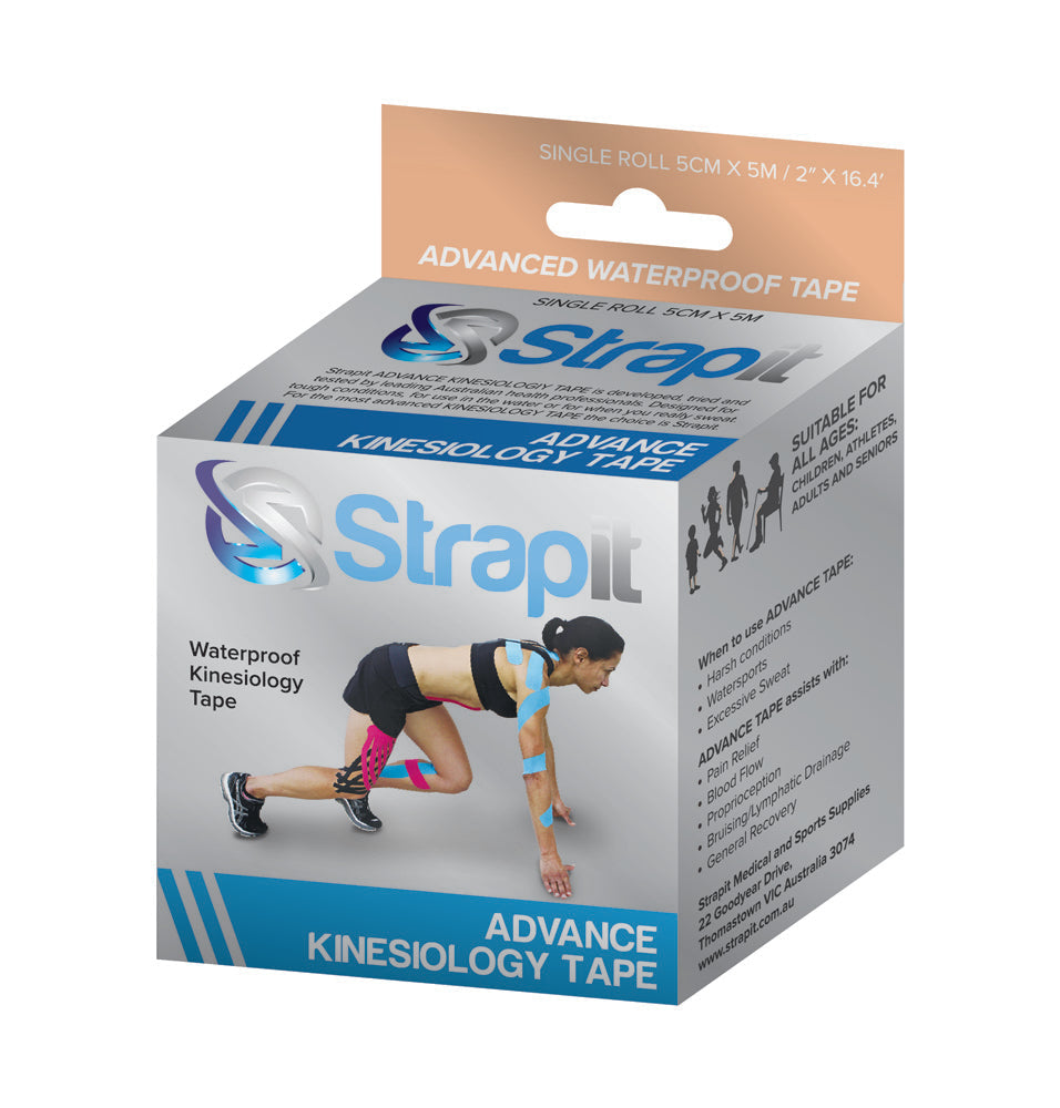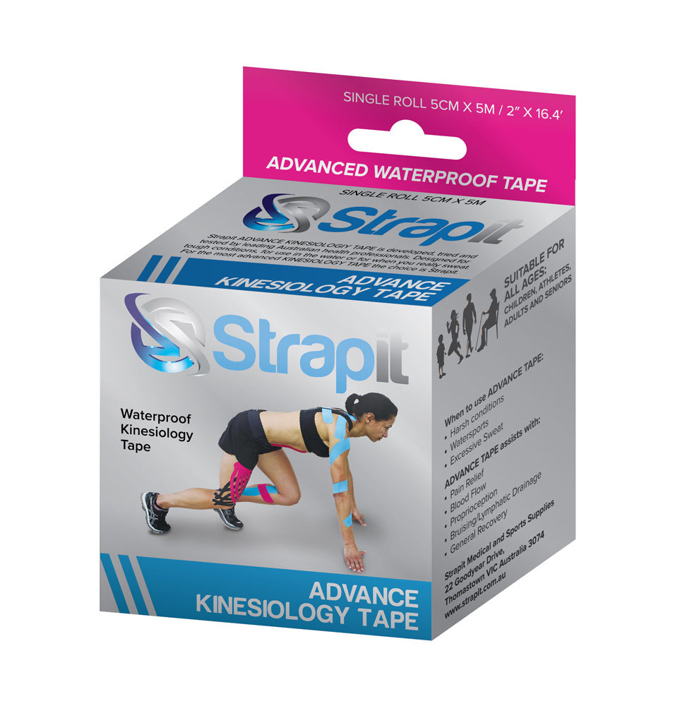 Strapit ADVANCE KTAPE is a world leading waterproof kinesiology tape. Swapping the traditional COTTON cloth material for a super shiny SYNTHETIC material immediately makes this tape more waterproof than others. Combined with this is a special water proofing agent and more quality adhesive, meaning it is the number one waterproof tape on the market